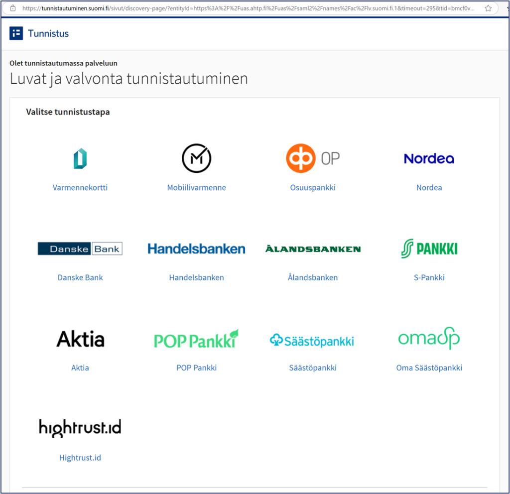 Asiointien valinnan jälkeen palvelu ohjaa hakemuksen tekijän tunnistautumaan (pakollista). Tunnistaudu palveluun käytössäsi olevan tunnistustavan mukaisesti.