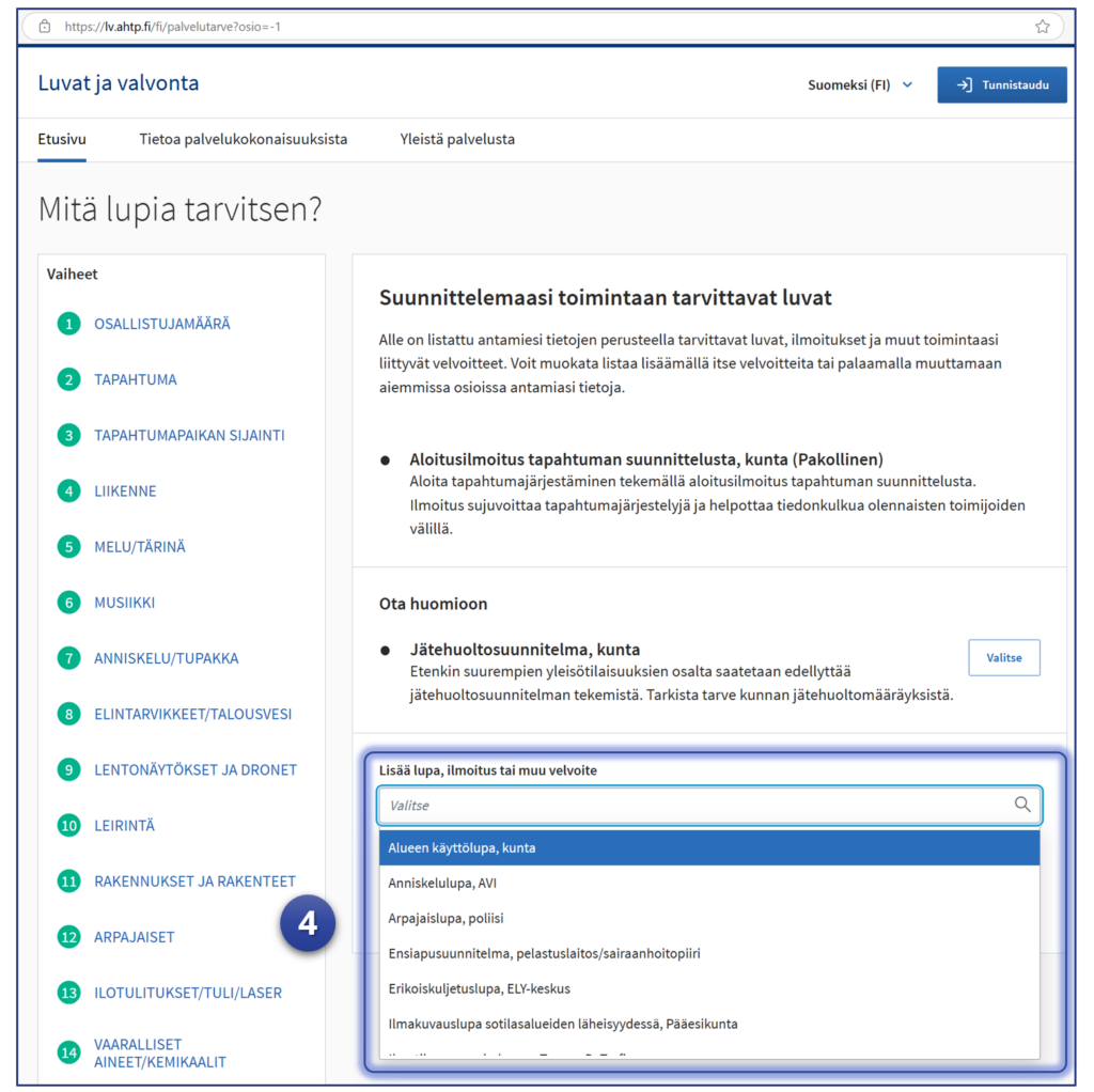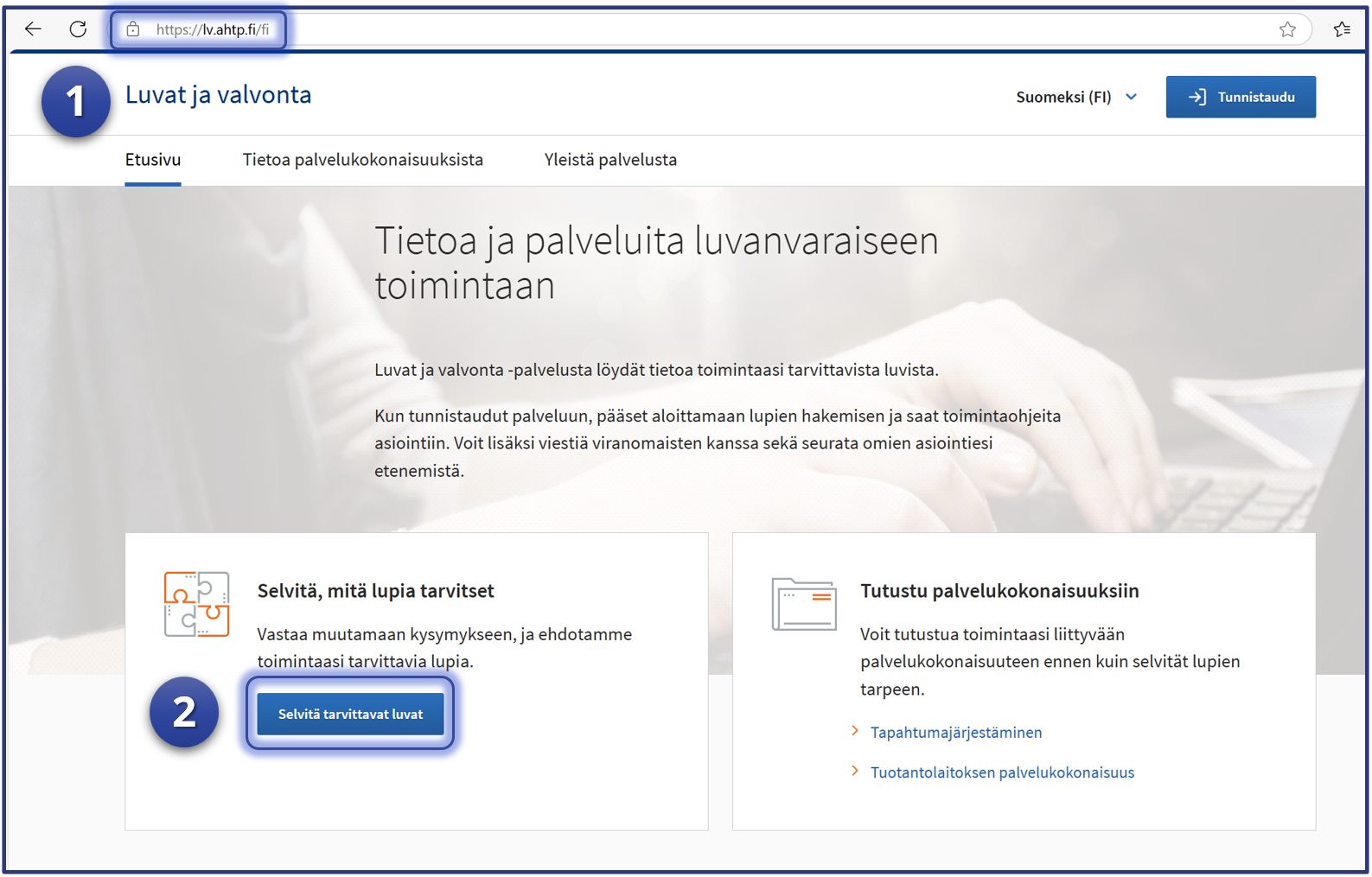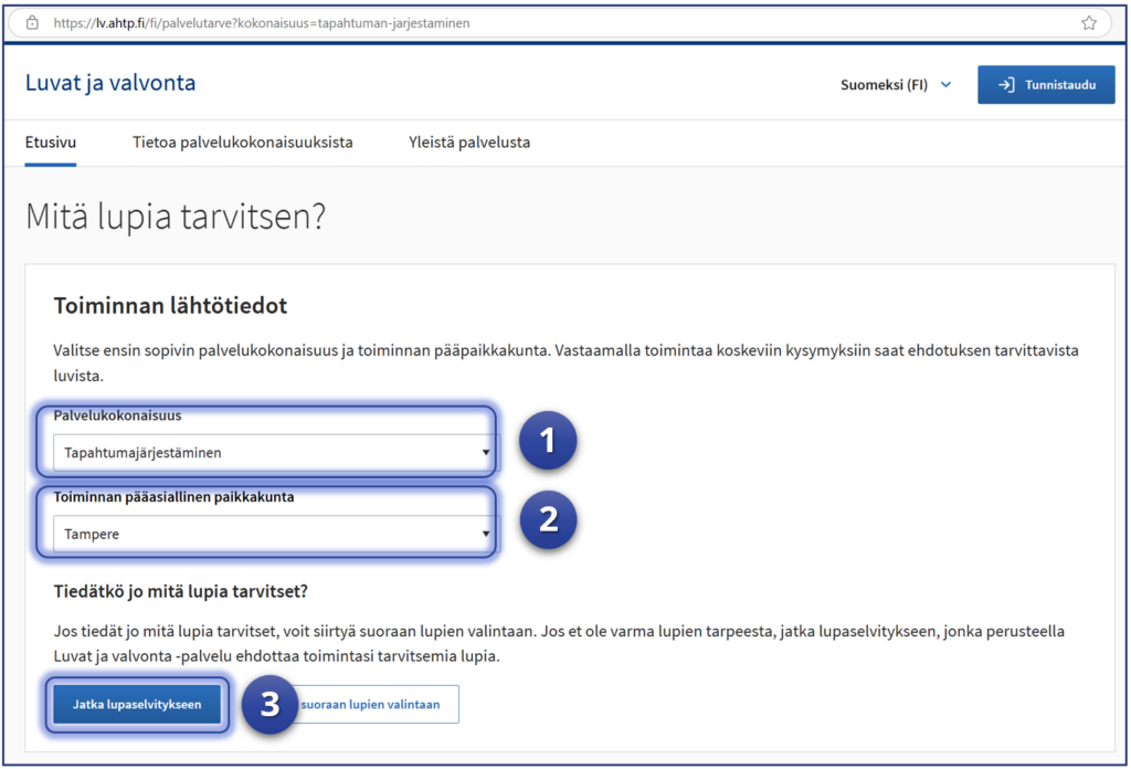 1. Aloita testaaminen – siirry Luvat ja valvonta -palveluun