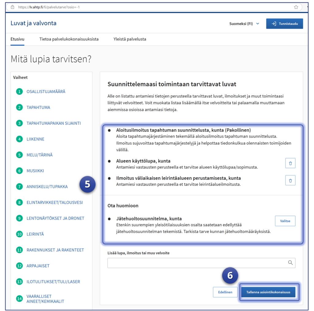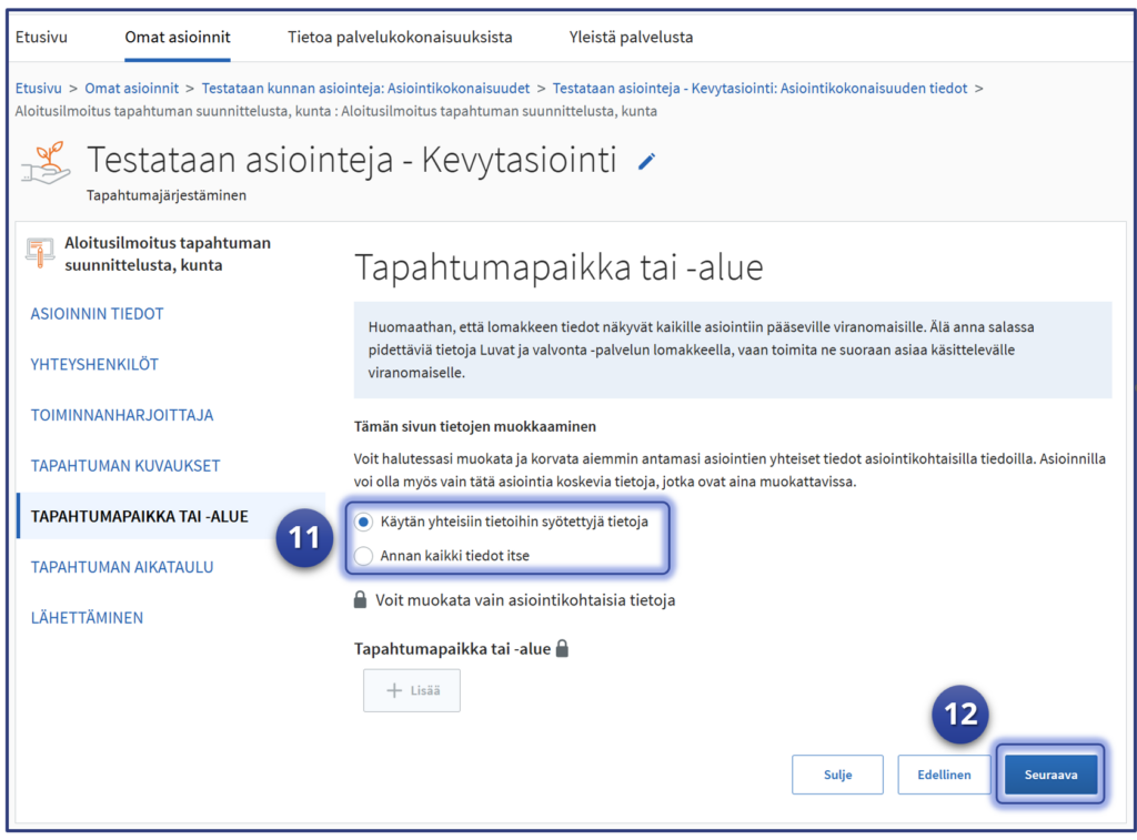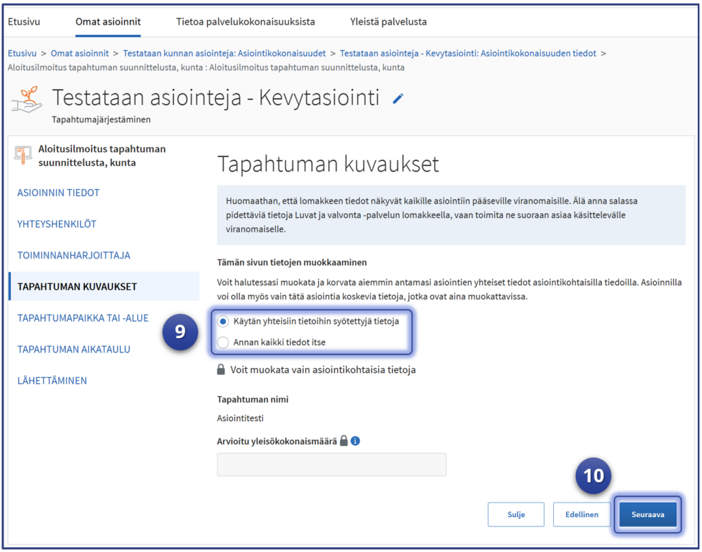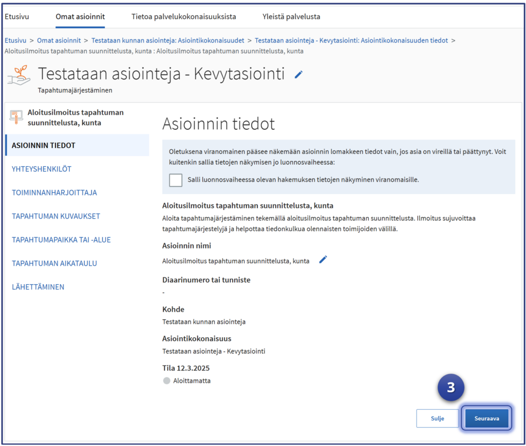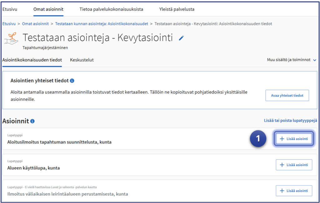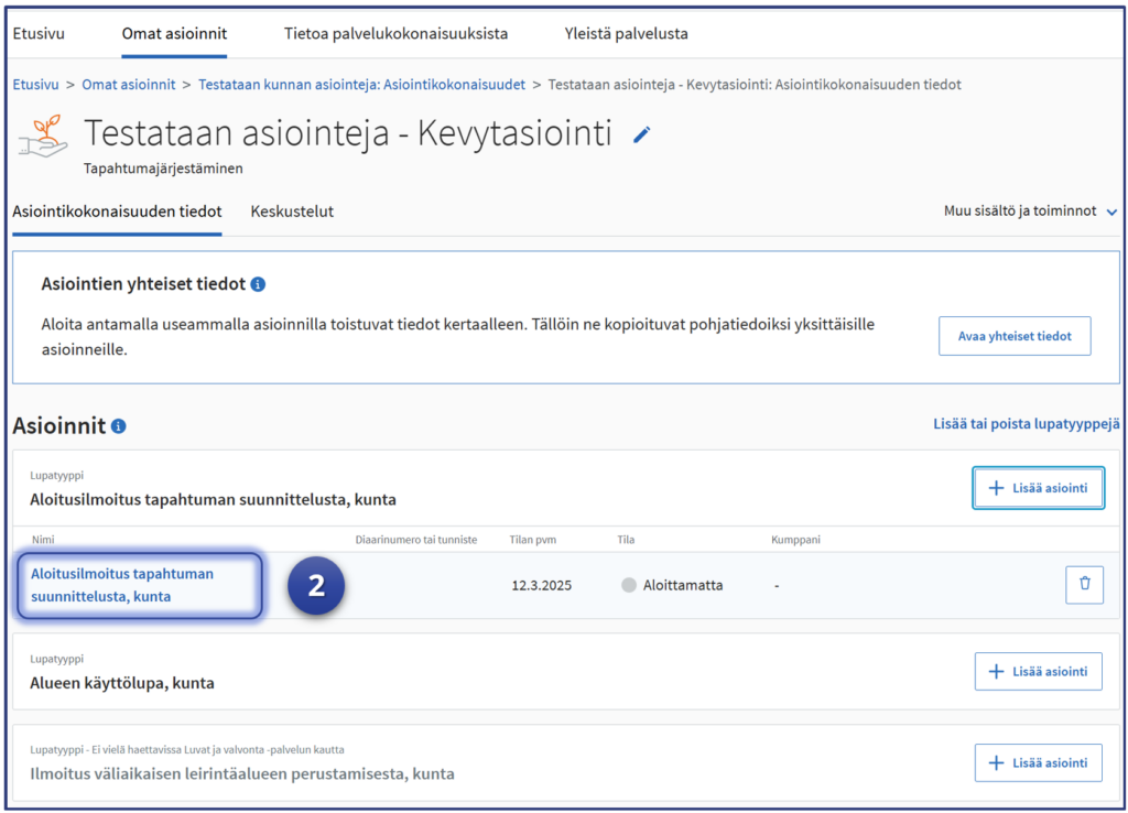 Esimerkki jatkaa siitä, mihin vaiheen kuusi “Yhteisten tietojen” syöttäminen jäi. Testaaja on Luvat ja valvonta -palvelun “Omat asioinnit“-sivulla ja asiointeihin on valittu testattavaksi Kevytasiointilomaketta hyödyntävä lupa-asiointi. Tässä esimerkissä kuntien tapahtumajärjestämiseen liittyvä ilmoitus “Aloitusilmoitus tapahtuman suunnittelusta” kuvaa testattavaa asiointia.