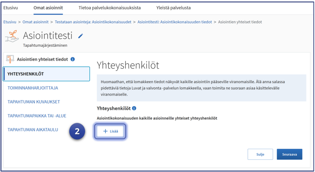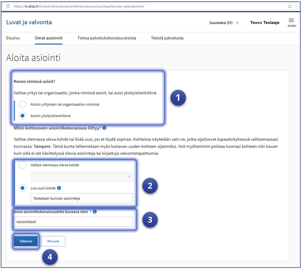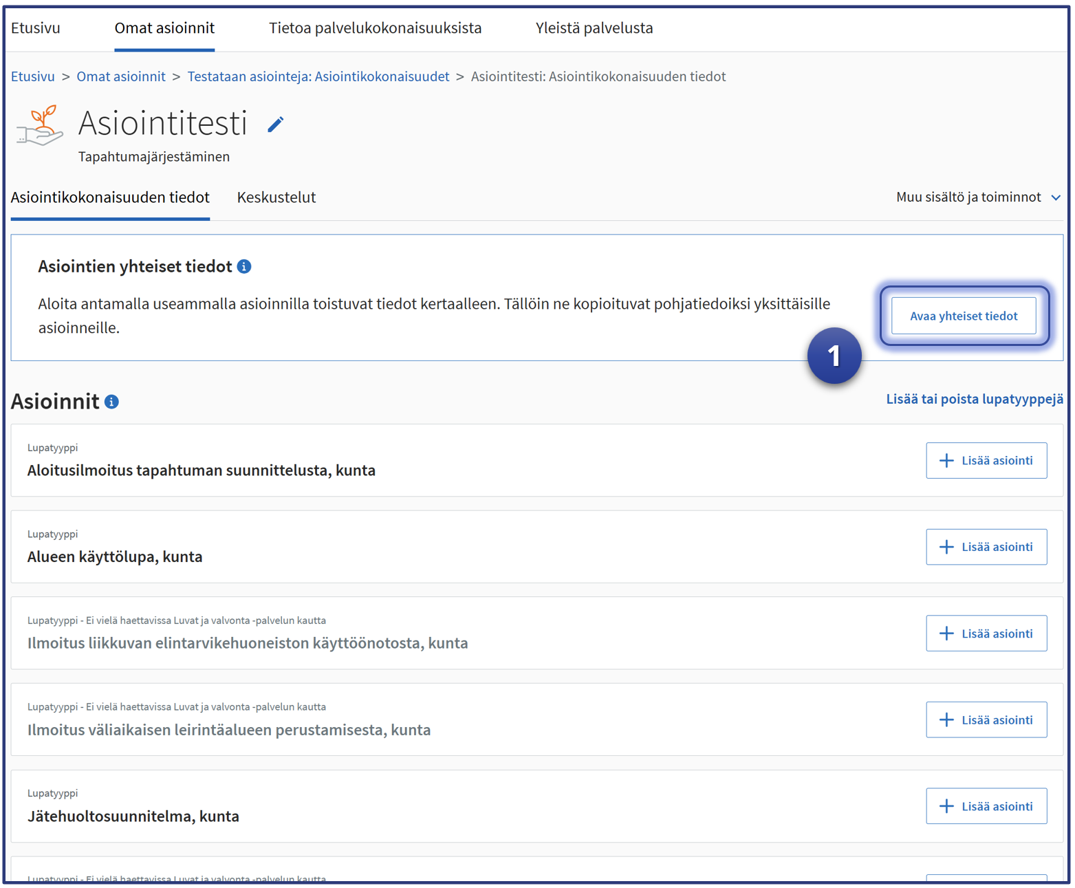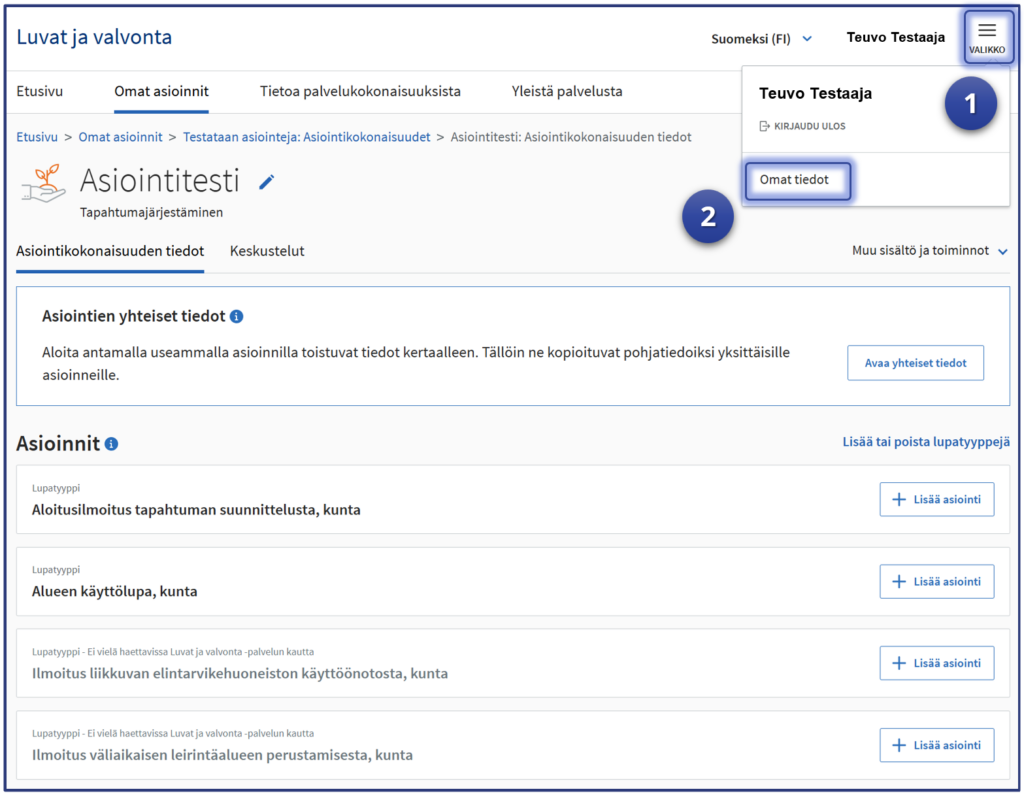 Täyttämällä lupa-asiointien yhteiset tiedot voit hyödyntää samoja tietoja useammassa asioinnissa ja vältyt samojen tietojen kirjoittamiselta useaan kertaan. Tämä vaihe ei ole pakollinen, mutta sujuvoittaa testin tekemistä.