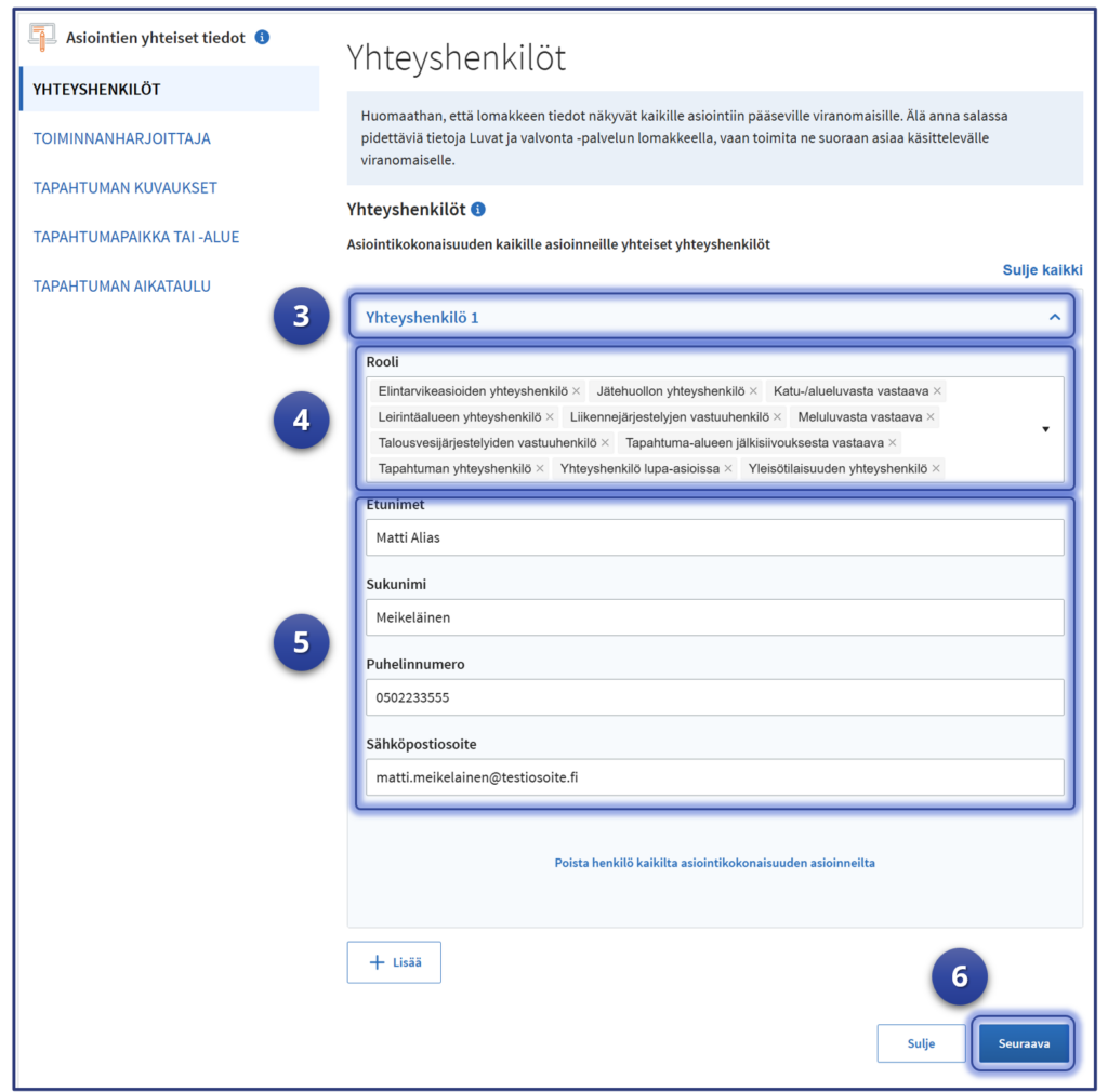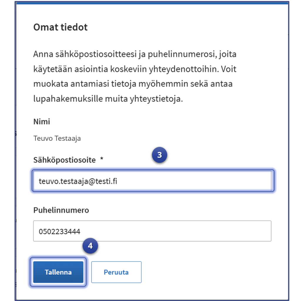 Testiä varten tarvitaan testaajan tiedot (sähköposti pakollinen), koska osa Luvat ja valvonta -palvelun toiminnallisuuksista käyttää hakijan yhteystietoja.