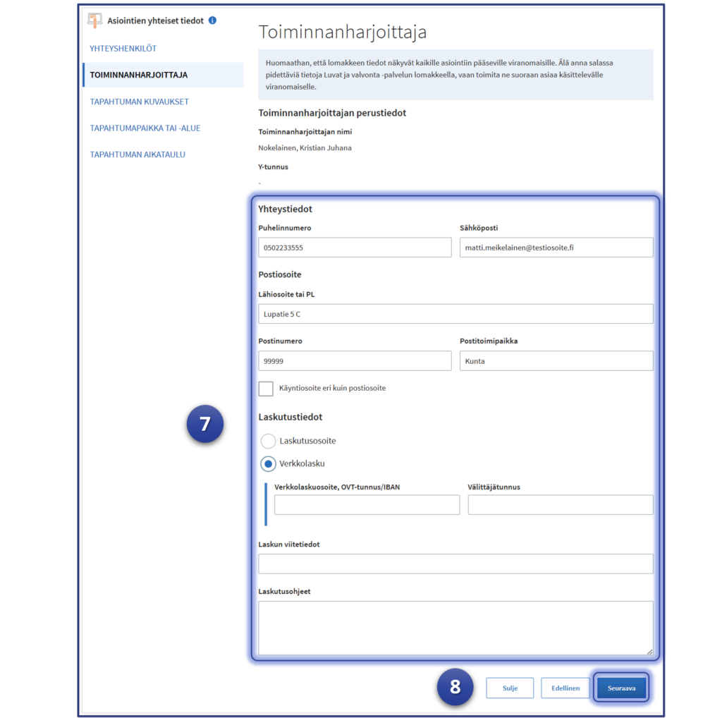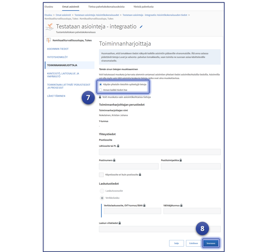 7. Täytetään tarvittavat toiminnanharjoittajan tiedot. Joidenkin asiointien osalta voi olla hyvä täyttää laskutustiedot, mutta se ei kaikkiin asiointeihin ole välttämätöntä.