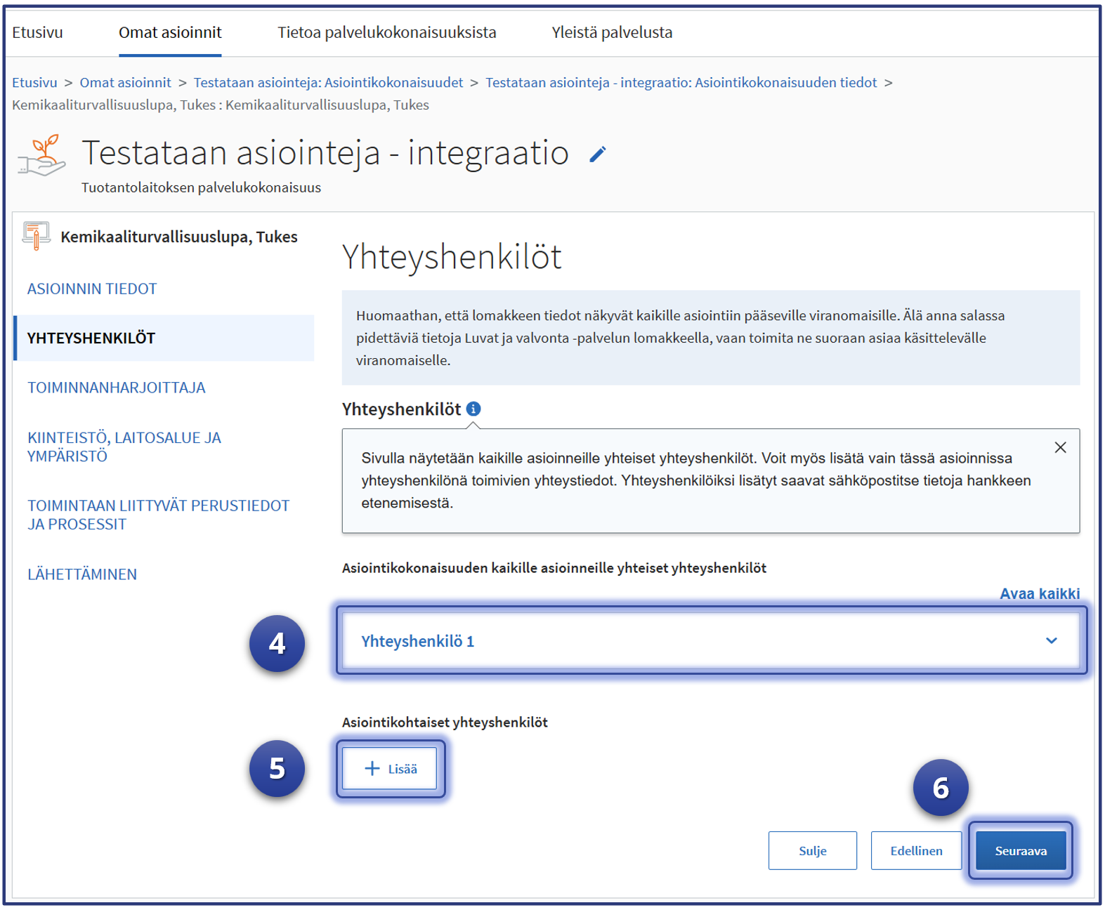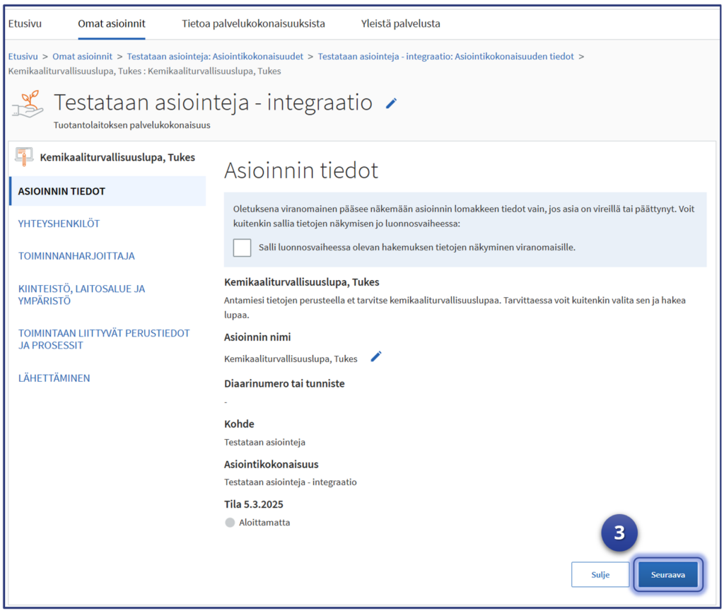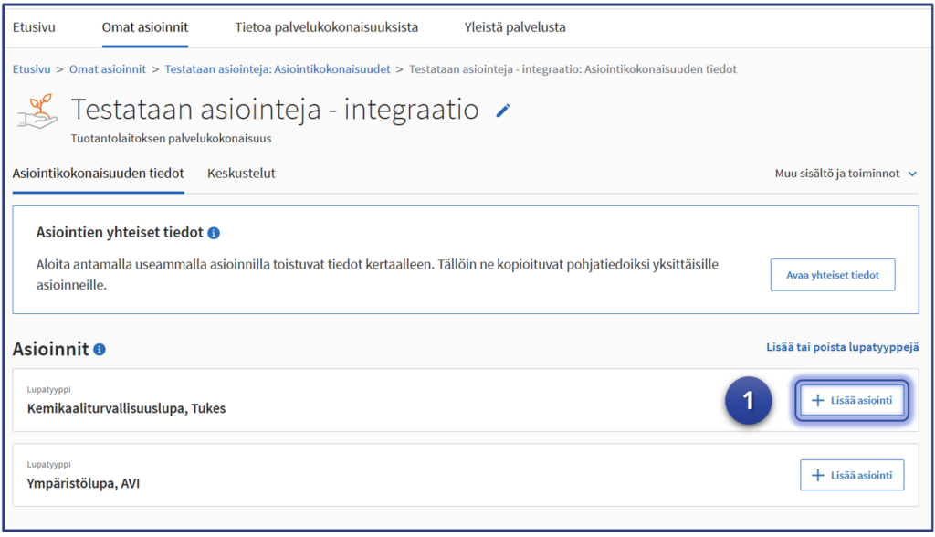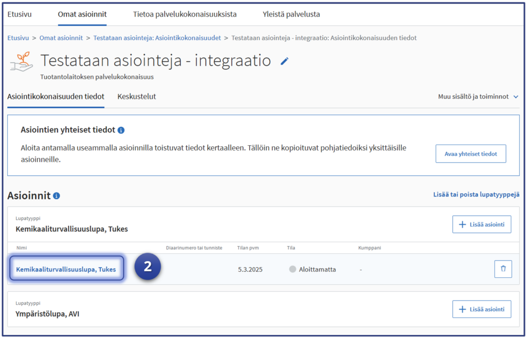 Esimerkki jatkaa siitä, mihin vaiheen kuusi “Yhteisten tietojen” syöttäminen jäi. Testaaja on Luvat ja valvonta -palvelun “Omat asioinnit“-sivulla ja asiointeihin on valittu testattava sähköistä tiedonsiirtorajapintaa hyödyntävä “integroitu” lupa-asiointi. Tässä esimerkissä Tukesin “Kemikaaliturvallisuuslupa” kuvaa testattavaa asiointia.