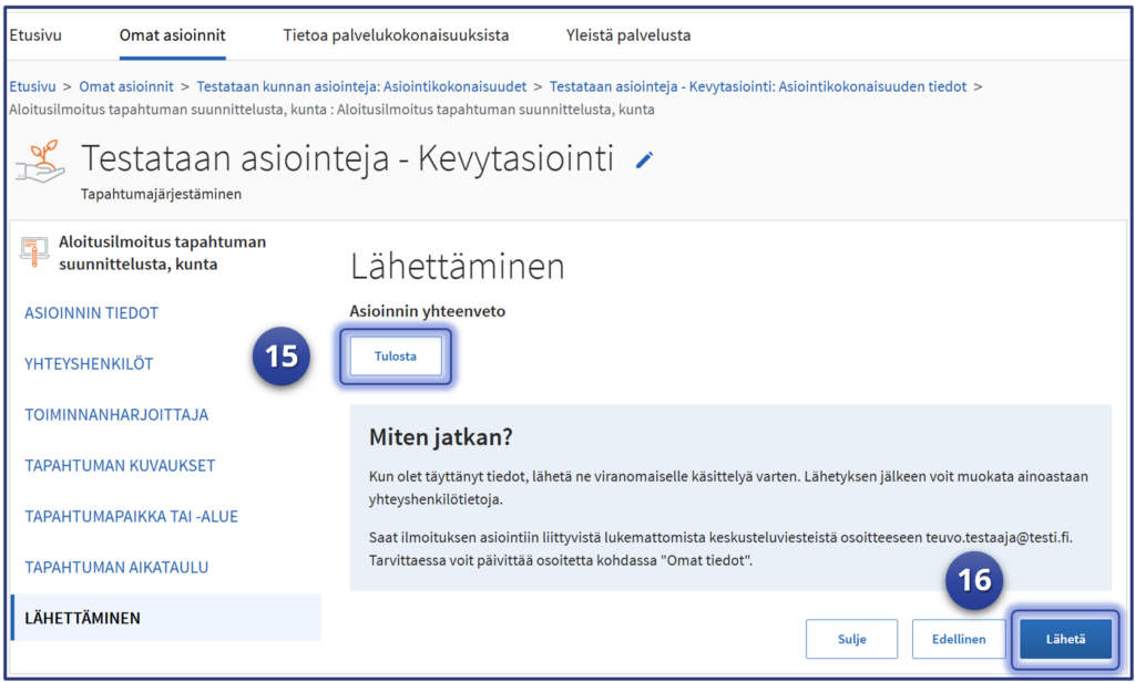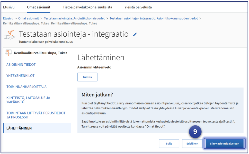 Kun testattavan asioinnin tiedot on annettu tietolehdille, voidaan hakemus lähettää viranomaisen palveluun, jossa testi suoritetaan loppuun asiointipalvelun ohjeiden ja prosessien mukaisesti.