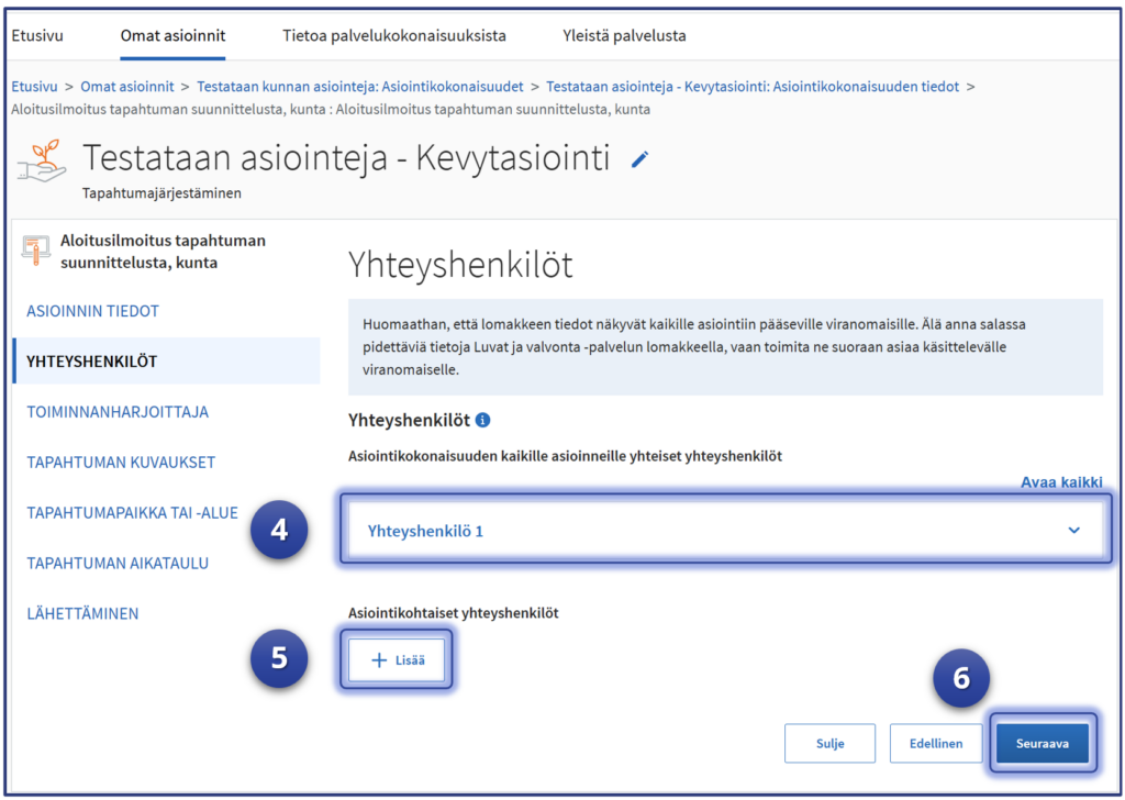 5. Tarvittaessa voit myös lisätä asiointikohtaisen yhteyshenkilön kohdasta “+Lisää“
