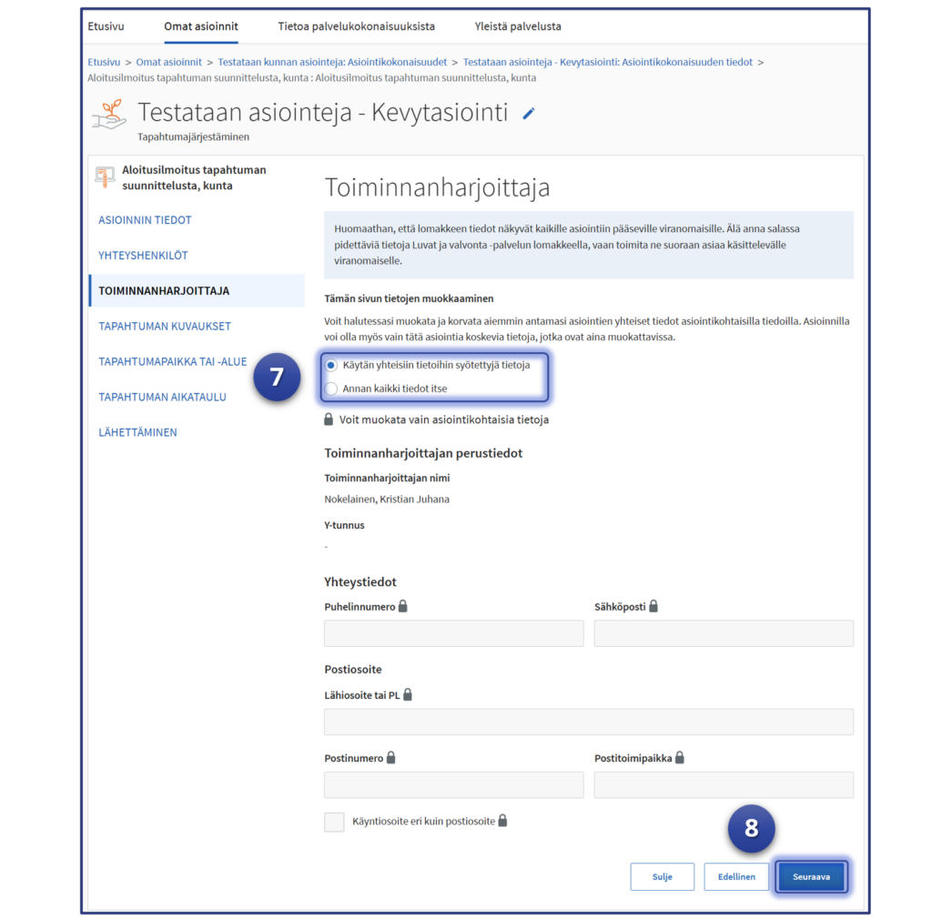 6. Kun yhteyshenkilö on annettu, voidaan jatkaa muihin asioinnin tietoihin. Valitse “Seuraava“