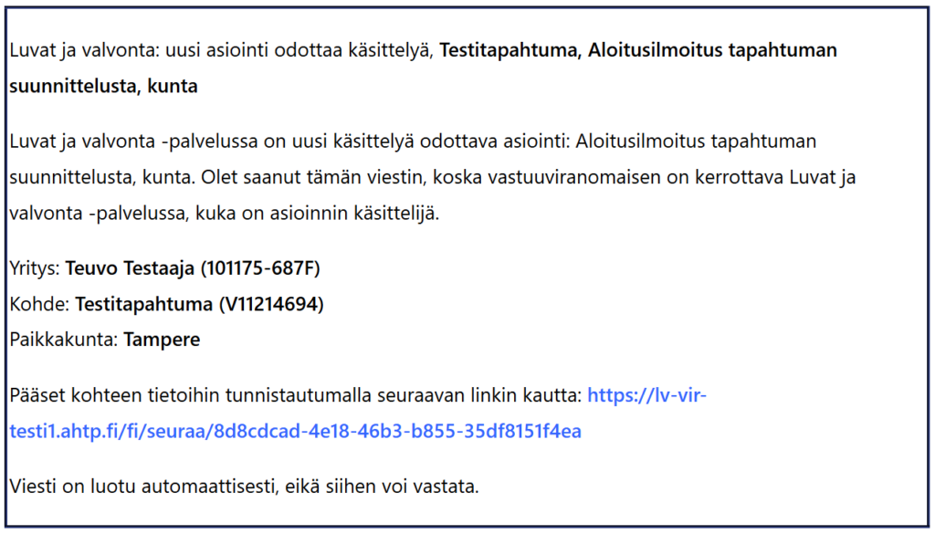 Avaa edellisessä vaiheessa tehtyä hakemusta koskeva heräteviesti, jonka Luvat ja valvonta -palvelun on lähettänyt organisaatiosi määrittämään osoitteeseen. Viestissä on linkki hakemukselle (esimerkissä sininen teksti, mutta heräteviestissä linkki, joka ohjaa tunnistautumisen kautta suoraan hakemukselle)