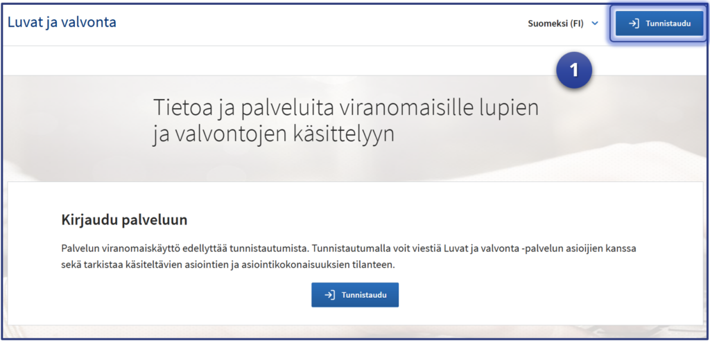1. Jos kuitenkin käytät viranomaiskäyttöliittymän osoitetta, tunnistaudu valitsemalla “Tunnistaudu”