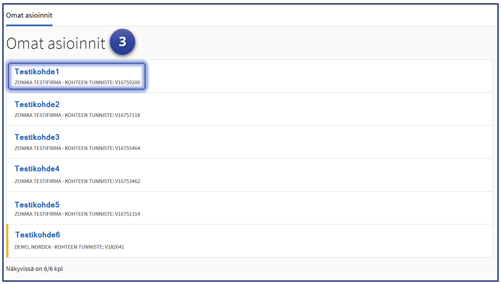 Testausvaiheessa “Omat asioinnit” -näkymässä näkyvät vain ne kohteet (yleensä yksi kohde), jotka viranomainen on testin alkuvaiheessa itselleen lähettänyt.