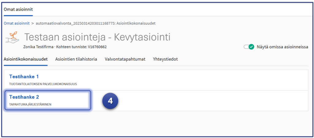 4. Valitaan testattava asiointikokonaisuus (esimerkissä Testihanke2, joka käsittää tapahtumajärjestämisen testattavat luvat)
