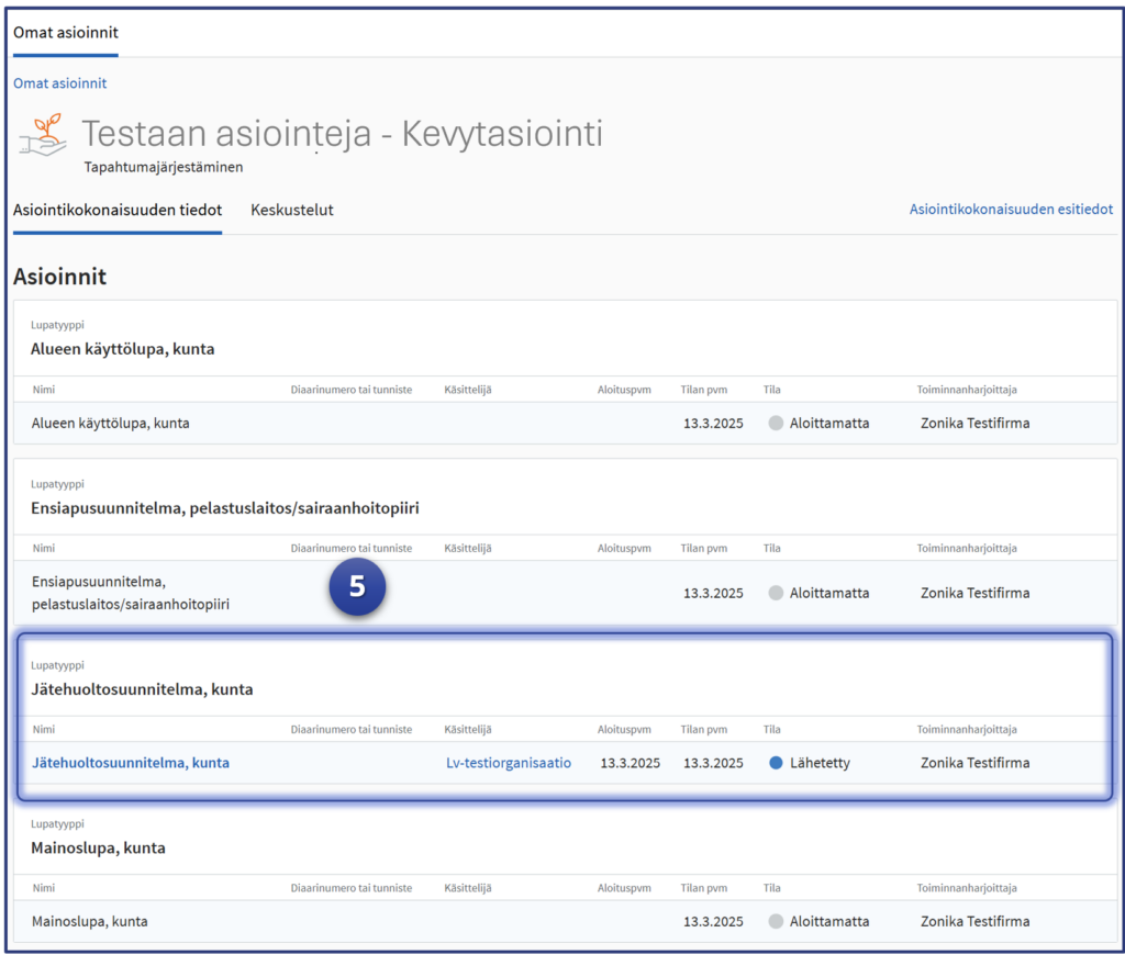 Tässä esimerkissä käsitellään kuntaviranomaisen jätehuoltosuunnitelma. Huomioi testikäsittelyssä, että eri asioinneilla on eri sisältöjä. Vain tietyt vaiheet toistuvat jokaisella asioinnilla ja ne käsitellään tässä esimerkissä.