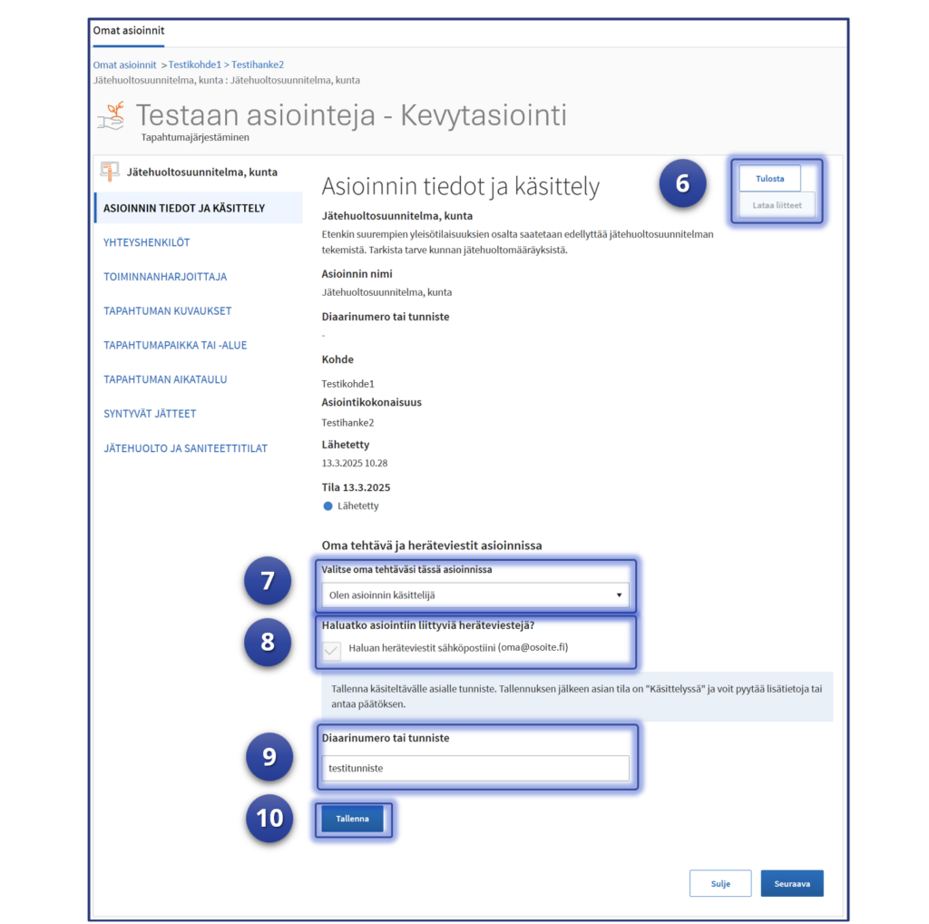 9. Anna asioinnille käsittelyjärjestelmän tai muu sellainen tunniste, jolla viranomainen helposti voi kohdentaa hakemuksen ja käsittelyn. Testitilanteessa voidaan käyttää muutakin tunnistetta.