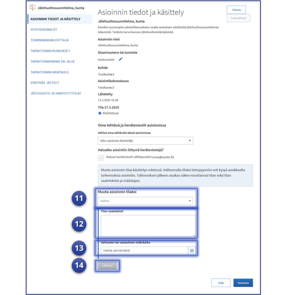 10. Tallenna muutokset, valitse “Tallenna“. Kun muutokset on tallennettu, muuttuu asioinnin tila “Lähetetty” -tilasta “Käsittelyssä” -tilaan.