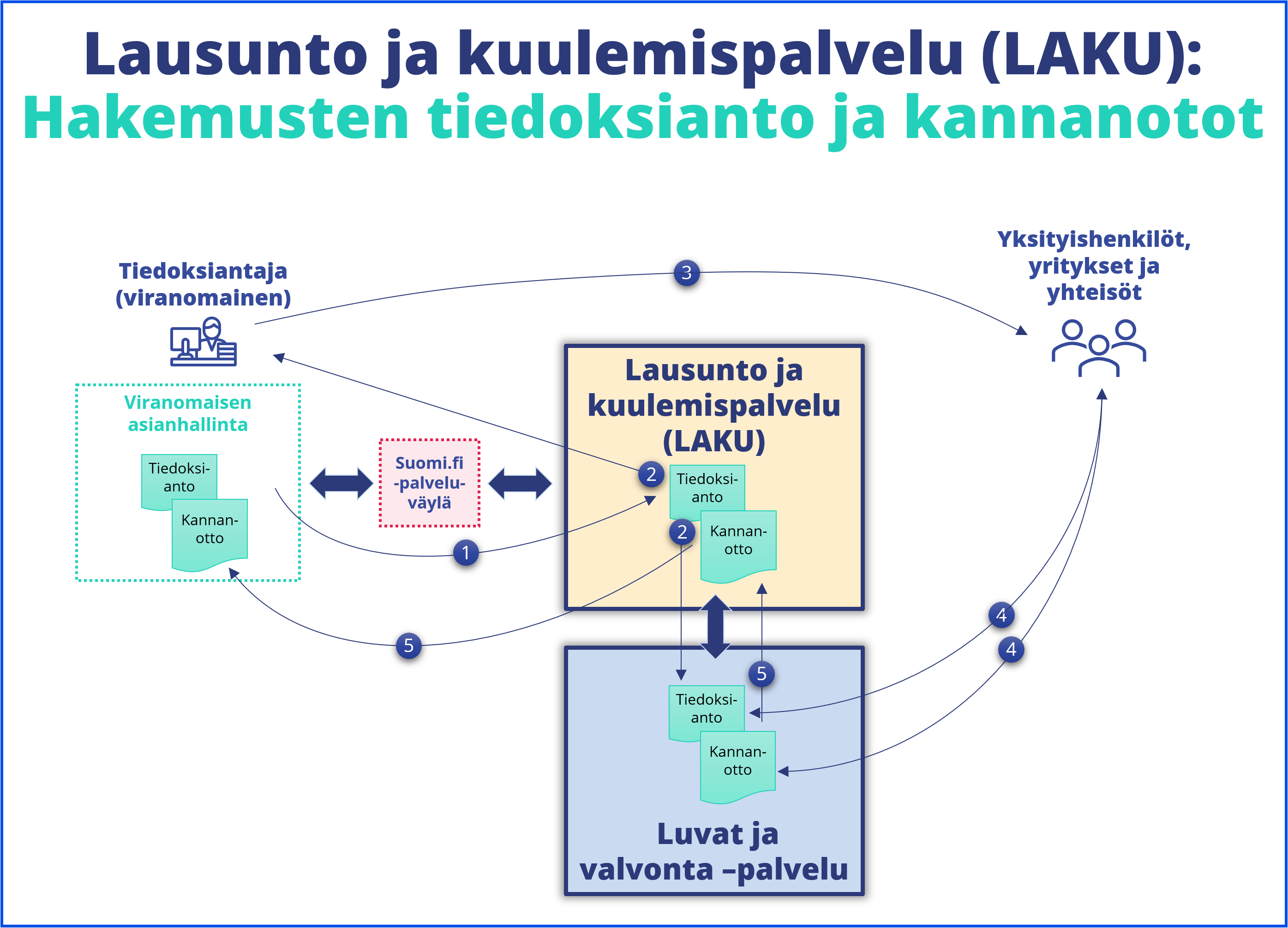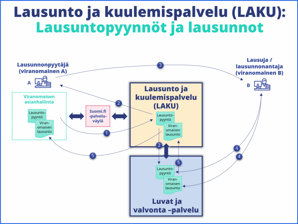 - Viranomainen tekee lausuntopyynnön asianhallinta- tai käsittelyjärjestelmässään, josta lausuntopyyntö siirtyy järjestelmien välisen yhteyden kautta LAKU-palveluun